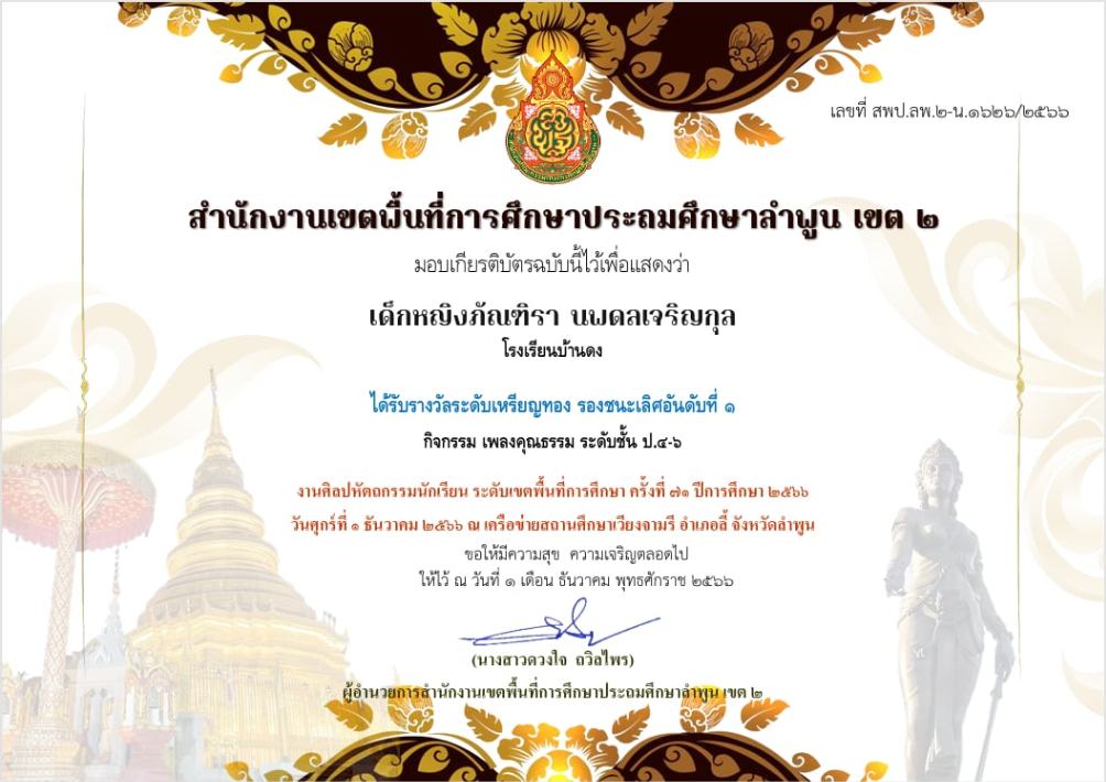ระดับเหรียญทอง ชนะเลิศ เพลงคุณธรรม ชั้น ป.4-6 ณ เครือข่ายสถานศึกษาเวียงจามรี ปีการศึกษา 2566